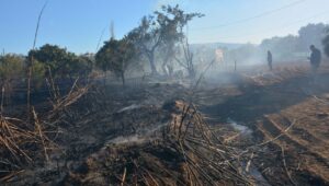 Aydın’da tarım arazisinde çıkan yangın zeytinliğe sıçradı, 3 dönüm alan zarar gördü.