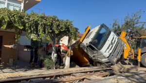 Bursa’nın İznik ilçesinde dolgu çalışması sırasında kum yüklü kamyon, zeminin çökmesiyle foseptiğe düştü.