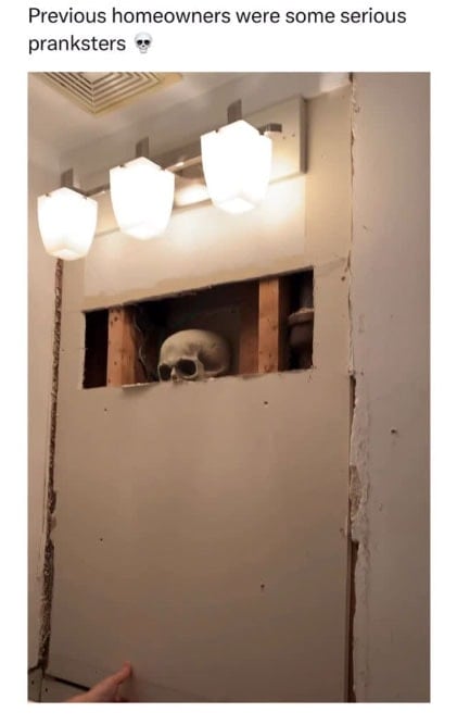 Kanada’nın Winnipeg kentinde yaşayan çiftin yaptığı tadilat sırasında açılan küçük bir delikten bakıldığında bir iskelet kafası görüldü. Çift panikle duvarı biraz daha açtı ve sonunda tüm iskeleti ortaya çıkardı. Ancak kısa sürede bunun gerçek olmadığını, plastik bir iskeletin kot pantolon, gömlek ve kemerle giydirildiğini fark ettiler.